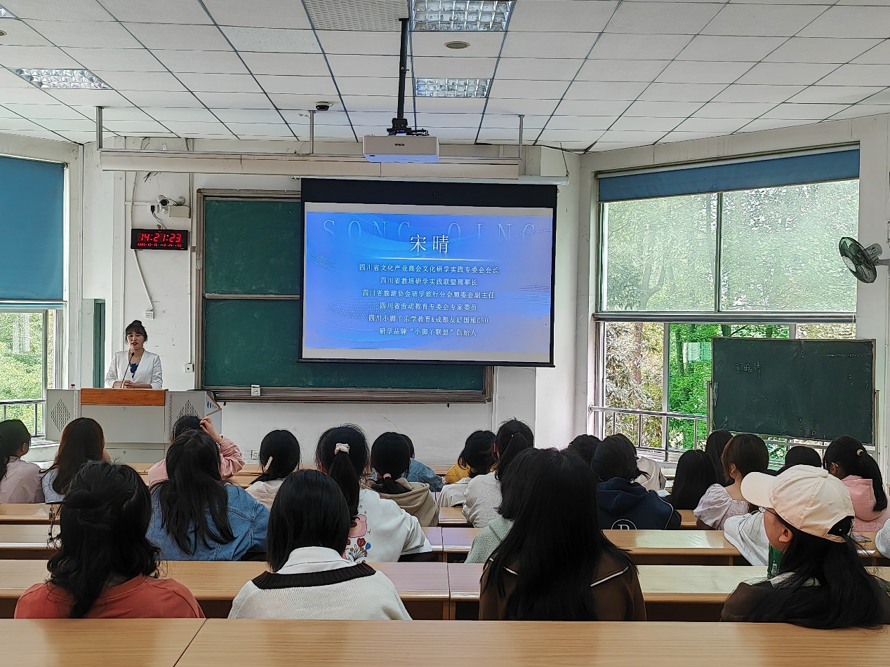 宋晴,西华大学betway88西汉姆联2014级MTI专业校友,现任四川小脚丫乐学教育 & 成都友好国旅 CEO。她分享的主题是“强内卷时代下,我如何C位出道?”。作为一名成功出道的创业者,她结合自己的丰富经验和心得,向我们介绍了在内卷时代如何脱颖而出,以便帮助我们更好地面对挑战。她指出,在强内卷时代,同学们需要有行动力,做到心态稳定、节奏稳定、理想稳定,方能破圈生长。