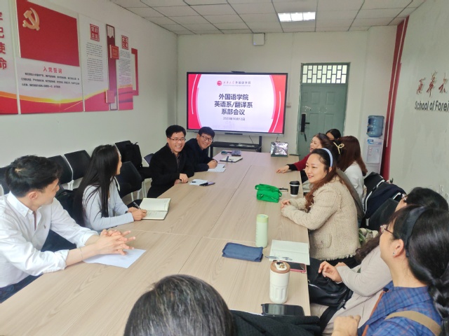 2023年10月12日,英语系和翻译系在学院会议室召开系部教研会。本次例会邀请学院院长李国宏教授和李学芹副院长莅临指导和交流,全体系部教师参加,宜宾校区老师线上同步参与。