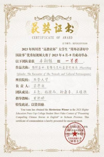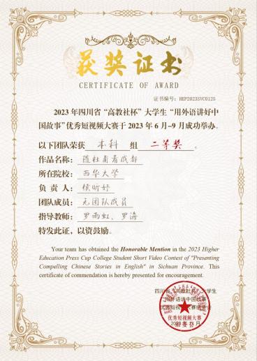 “高教社杯”大学生“用外语讲好中国故事”优秀短视频作品征集活动(大赛)分为校赛、省赛和全国总决赛三个阶段。外院学子凭借优秀的双语能力在此次大赛的校赛和省赛中脱颖而出。其中,2021级翻译专业杨谨菡,2021级数字与媒体艺术专业杨嘉译,2021级翻译专业徐磊制作的作品《flavour in chengdu(烟火成都)》,2021级英语专业苏亭羽,2022级英语专业王尧,2020级翻译专业杨濮而,2021级英语专业徐康卓,2021级英语专业王俊钦制作的作品《锦绣盛世:蜀锦与文化盛宴的邂逅(Flourishing Splendor: The Encounter of Shu Brocade and Cultural Extravaganza)》均获得四川赛区一等奖,分别由许媛鹓老师和甘熙婷老师指导。2020级翻译专业侯昕妤制作的作品《随杜甫看成都》获得四川赛区二等奖,由罗雨虹老师和罗海老师指导。
