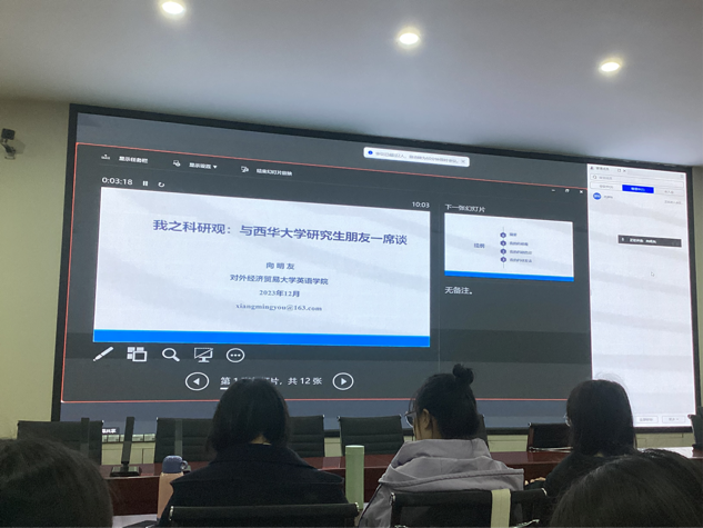 12月12日上午,对外经济贸易大学英语学院院长、博士生导师向明友教授在线上进行了题为“我之科研观:与西华大学研究生朋友一席谈”的学术讲座,报告会由betway88西汉姆联副院长李学芹教授主持,betway88西汉姆联2022级、2023级研究生按时到场聆听讲座。