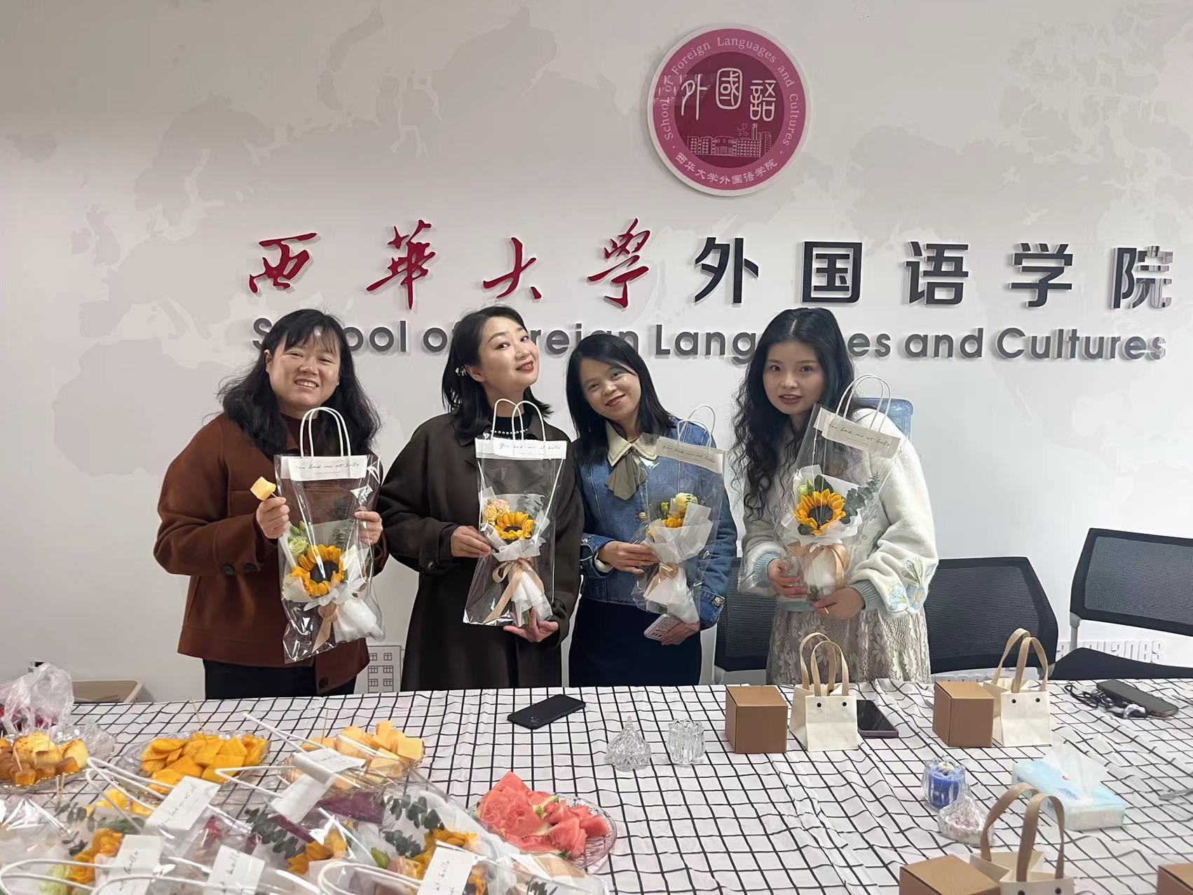 3.8日当天,为郫都校区和宜宾校区有课的52位女老师送花,由学院团委学生会同学送至相应教室,为在岗女教师送上节日祝福,并拍照留念,引导和鼓励广大女职工立足岗位、争先创优,以健康向上、充满活力的精神面貌迎接新时代。