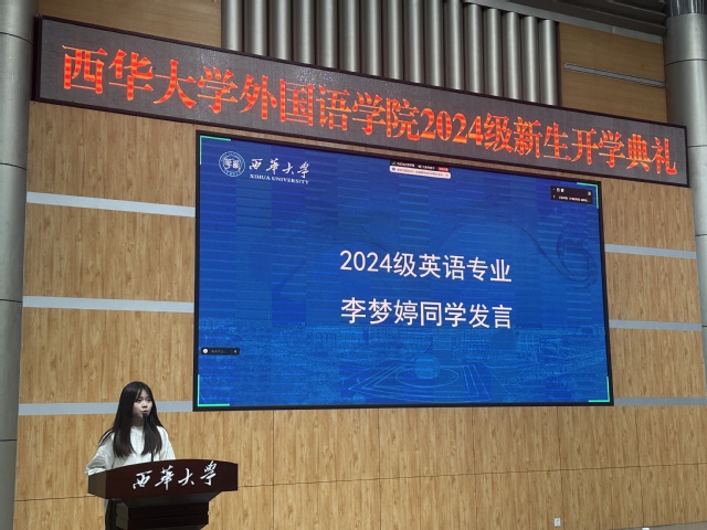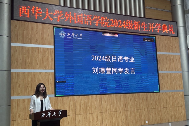 此外,2024级英语专业新生代表李梦婷同学同学复盘了过去的得与失,总结出两个适用于大学生活的关键词——勇敢与责任,并对西华大学表达出感谢与憧憬。 2024级日语专业代表刘璟萱同学发表演讲,表达了自己对即将开始的大学生活的期待和激动。