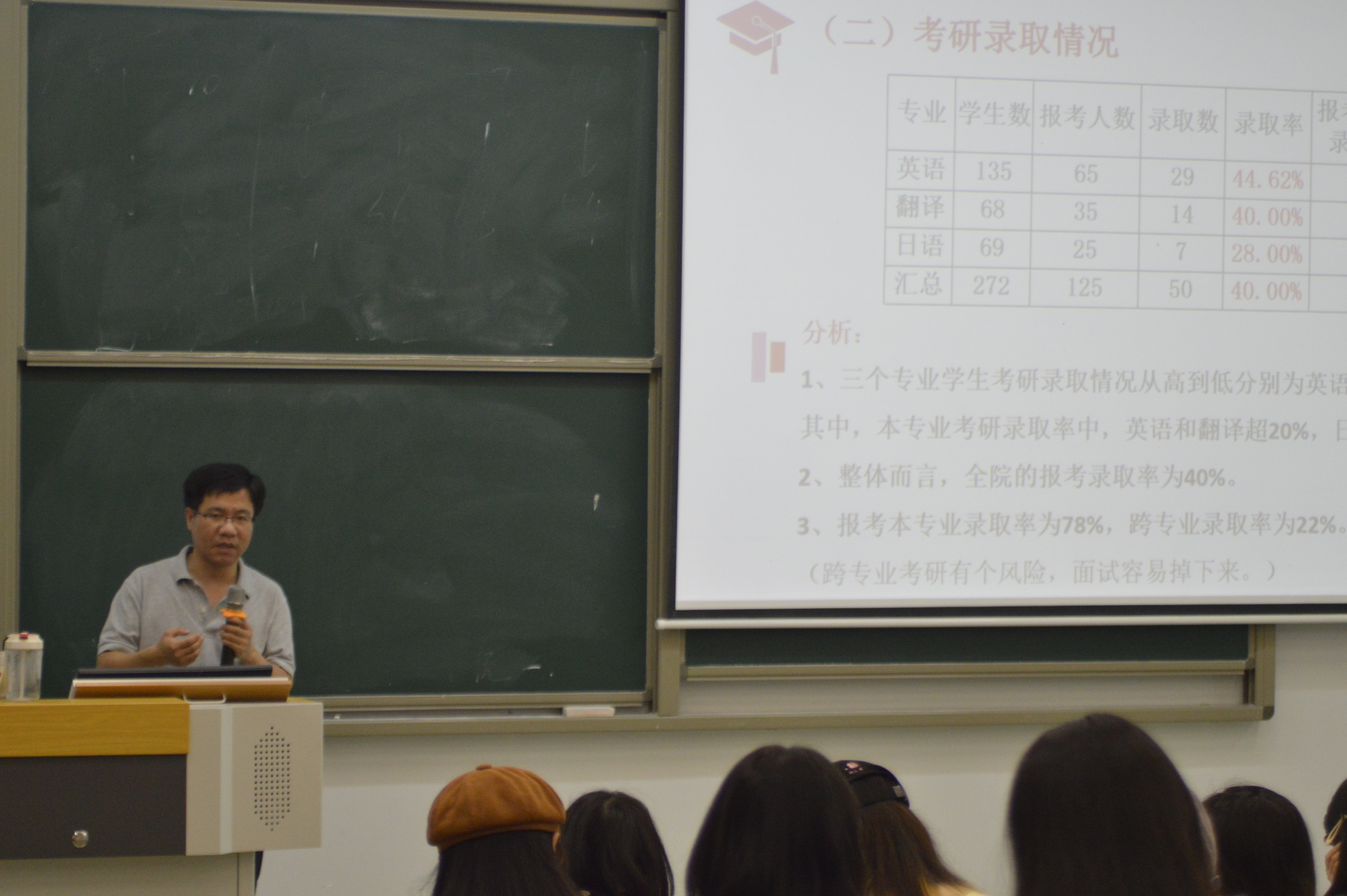 此外,李国宏院长详细介绍了考研的相关政策和备考要点。他对近年来翻译专业考研的形势进行了分析,为同学们提供了清晰的报考方向建议。在备考方面,院长强调了制定合理学习计划的重要性,鼓励同学们要注重基础知识的巩固,如词汇积累、语法掌握等,同时要加强翻译实践训练,提高翻译技巧和速度。他还提醒同学们要关注时事热点,将其融入到日常学习中,以应对考试中可能出现的与现实紧密结合的题目。