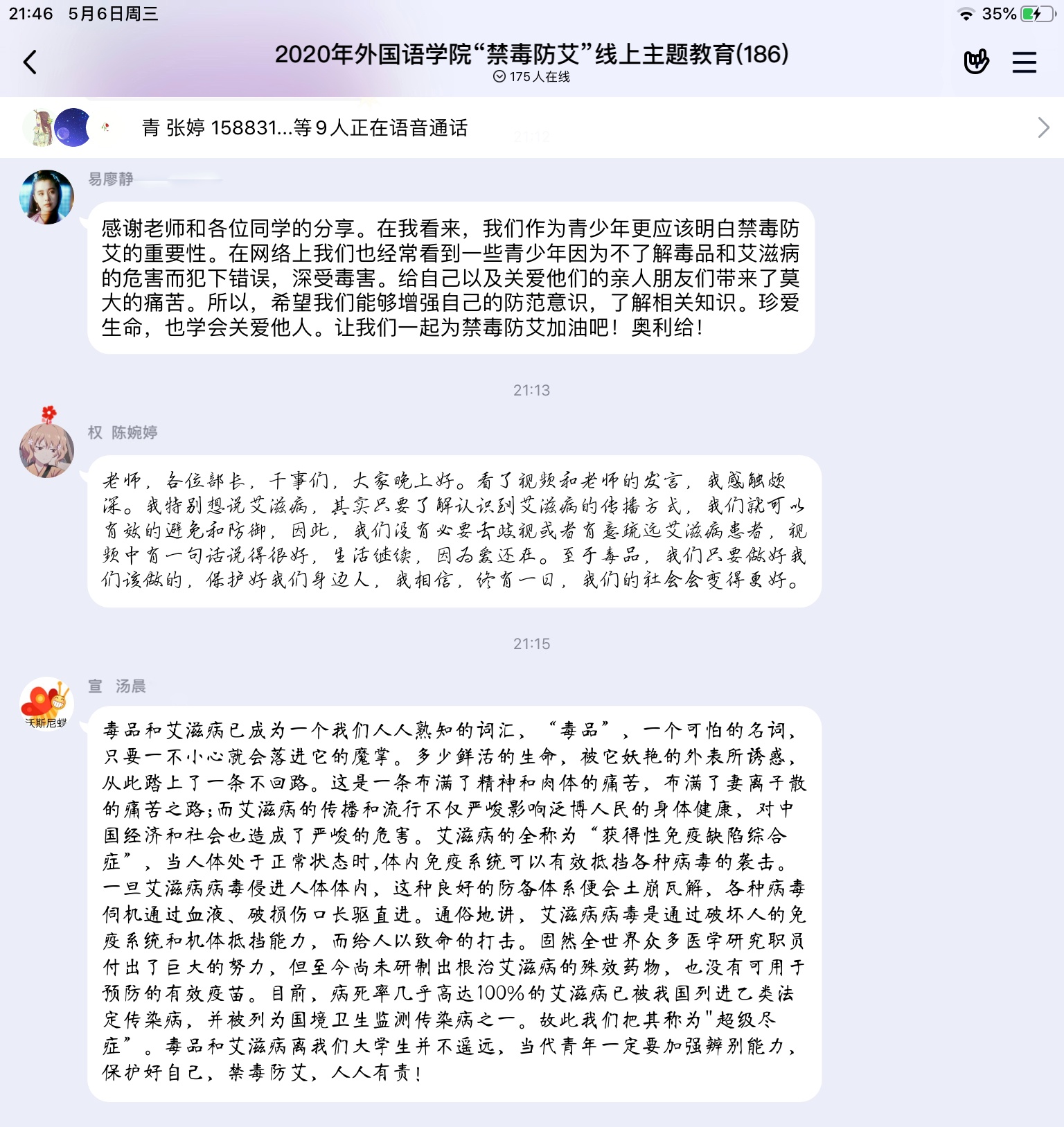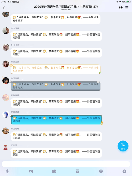 本次活动在同学们的宣誓中结束。由于疫情,本次活动只能线上开展,但是同学们认真学习禁毒防艾相关知识的热情不减,并积极分享自己的见解与看法,相信大家在以后的生活中也会将本次活动中学习到的禁毒防艾知识铭记于心、贯彻于行。