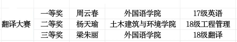 最终,我院英语专业周云春同学斩获一等奖,工程管理学专业杨天瑜同学和翻译专业梁朱莉同学分别获得第二、三等奖。