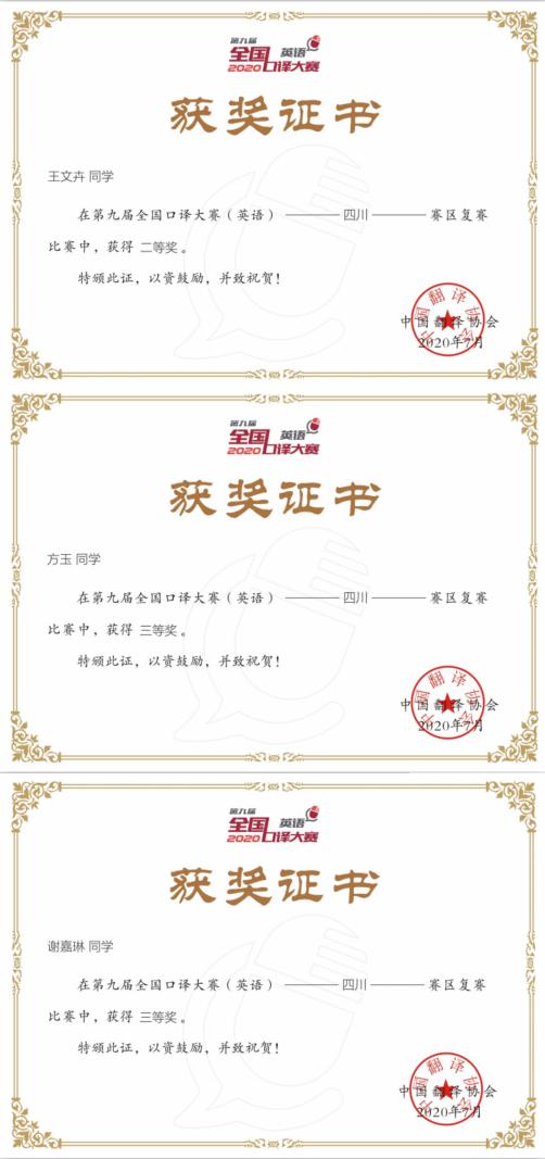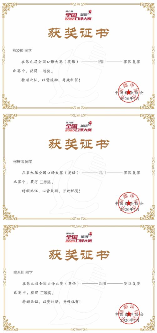 2020年6月21日,第九届全国口译大赛(英语)四川赛区复赛圆满落幕,因受疫情影响,大赛组委会将本次比赛调整为线上竞赛。全国口译大赛(英语)由中国翻译协会主办、中国外文局指导,是展现全国在校大学生英语口译应用能力的高水平赛事活动,旨在促进翻译学科建设和语言服务行业的繁荣与发展、培养高素质语言服务人才,更好的服务国家发展大局和国际传播能力建设。
