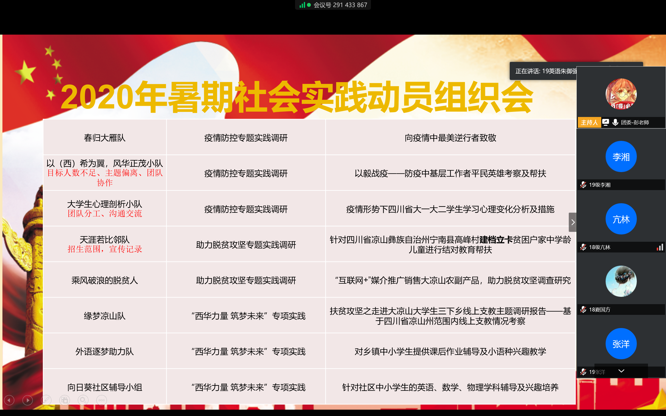 随后,八支社会实践队队长分别就实践主题、进展安排、面临问题等进行了介绍。最后,彭老师就各个队伍面临的问题进行了答疑,就活动注意事项、调研宣传、成果完善等方面给予了建议,并预祝各个团队顺利完满完成本次实践。