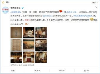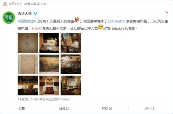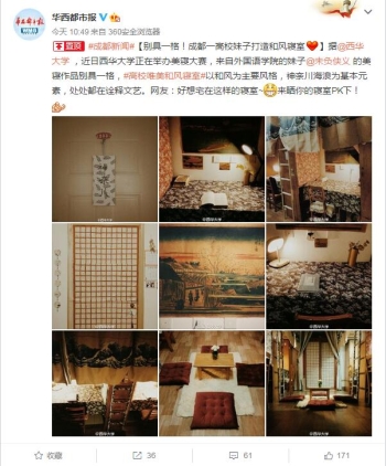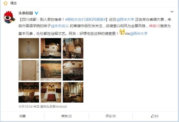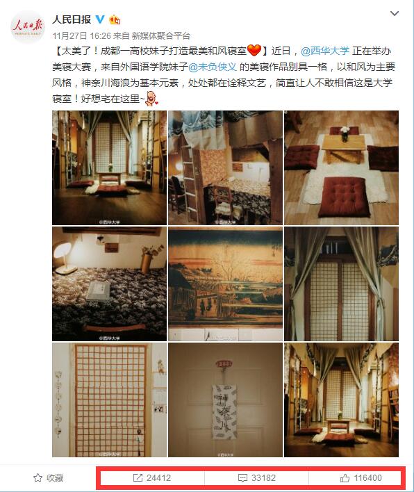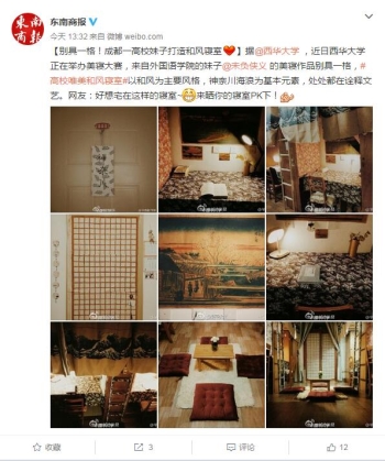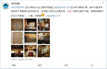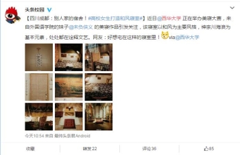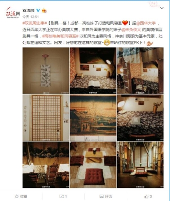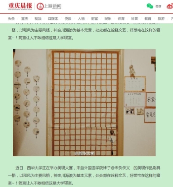 近期,一组我院德馨苑6栋253寝室图片在网络上走红,网络“大V”人民日报、直播成都、头条校园、成都晚报、华西都市报、新浪四川、双流网等纷纷转载。截至2016年11月27日下午14:00,@成都晚报发起的话题#高校女生打造和风寝室#阅读人数10.1万+;@华西都市报发起的#高校唯美和风寝室#话题阅读人数20.4万+。