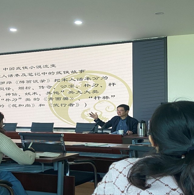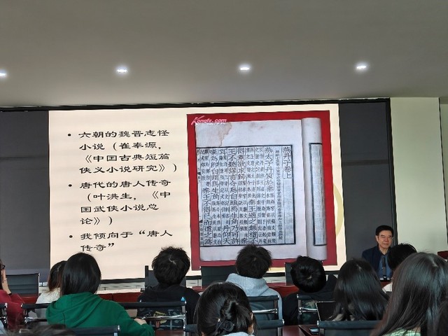 区教授先介绍了武侠小说的起源,对不同小说家的生平经历和写作风格侃侃而谈。然后详细讲解了武侠小说的流变。接着贯穿中外,引经据典,比较了西方的骑士和中国“侠”的不同之处,横向介绍武侠和汉语的博大精深巧妙结合,与儒释道三教的联系,最后高度概括武侠小说与历史相贯通。