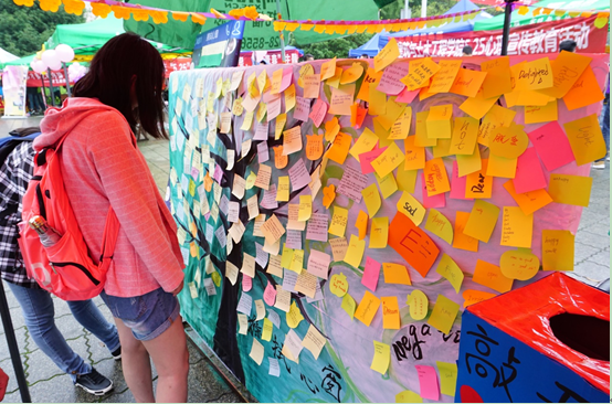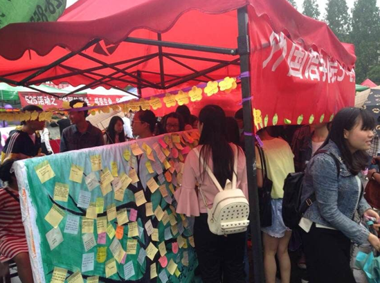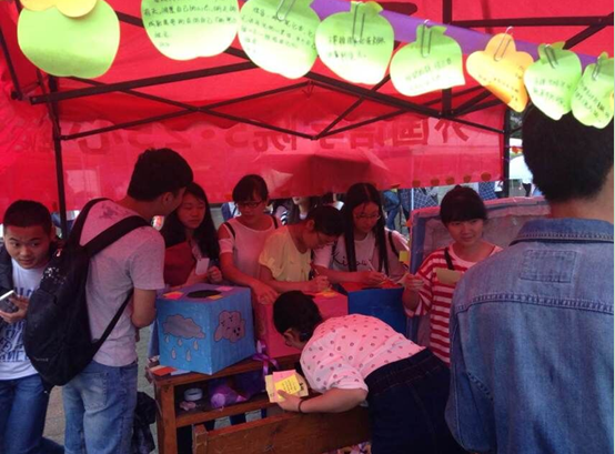 “敲开心门——单词组拼”环节要求参与者随机挑出一张卡片,根据卡片上的字母,想出一个与心理有关的单词,将能想出的单词根据感情色彩分类,分别贴到optimistic或pessimistic两个板块里,活动增强了英语的趣味性,帮助了学生树立积极的心态。“清理心房——扔掉烦恼”邀请参与者写下自己的烦恼,丢入“烦恼吞噬机”,拿走一片写着正能量的树叶,使心灵由负转化为正,帮助其缓解心理压力。“擦拭心窗——你的烦恼他帮忙”环节以生动略带搞笑的对话形式,创造一种能让同学们主动分享苦恼以及在苦恼中激励自己的轻松的氛围。“粉刷心墙——心理知识漂流瓶”以漂流瓶的形式,向参与者普及心理健康小知识。