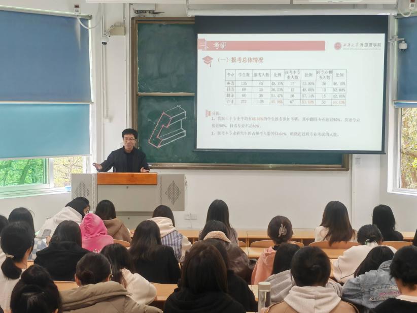 教学办主任曾渝理、英语系系主任梁勇也分别在会上发言,他们就考研和就业的具体问题与学生进行了互动交流,为学生提供了实用的建议。梁勇老师对学生本学期陆续进行的毕业实习、毕业论文撰写等进行了进一步指导和答疑。