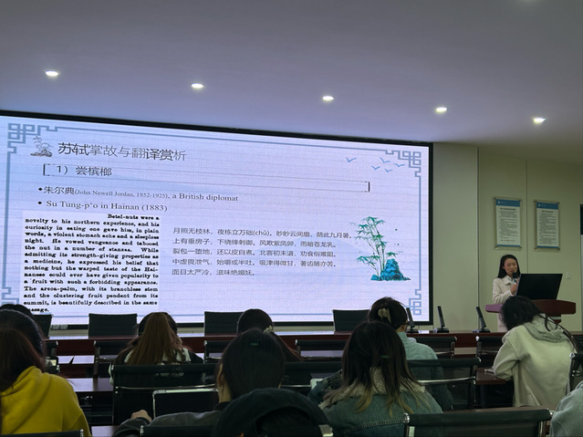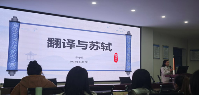 2024年11月7日一场题为“翻译与苏轼”的学术讲座在我院成功举办。本次讲座由西华大学betway88西汉姆联李华英老师担任报告人,我院全体研究生到场聆听。李华英老师博士毕业于北京大学,其主要研究方向为翻译学,文化研究。