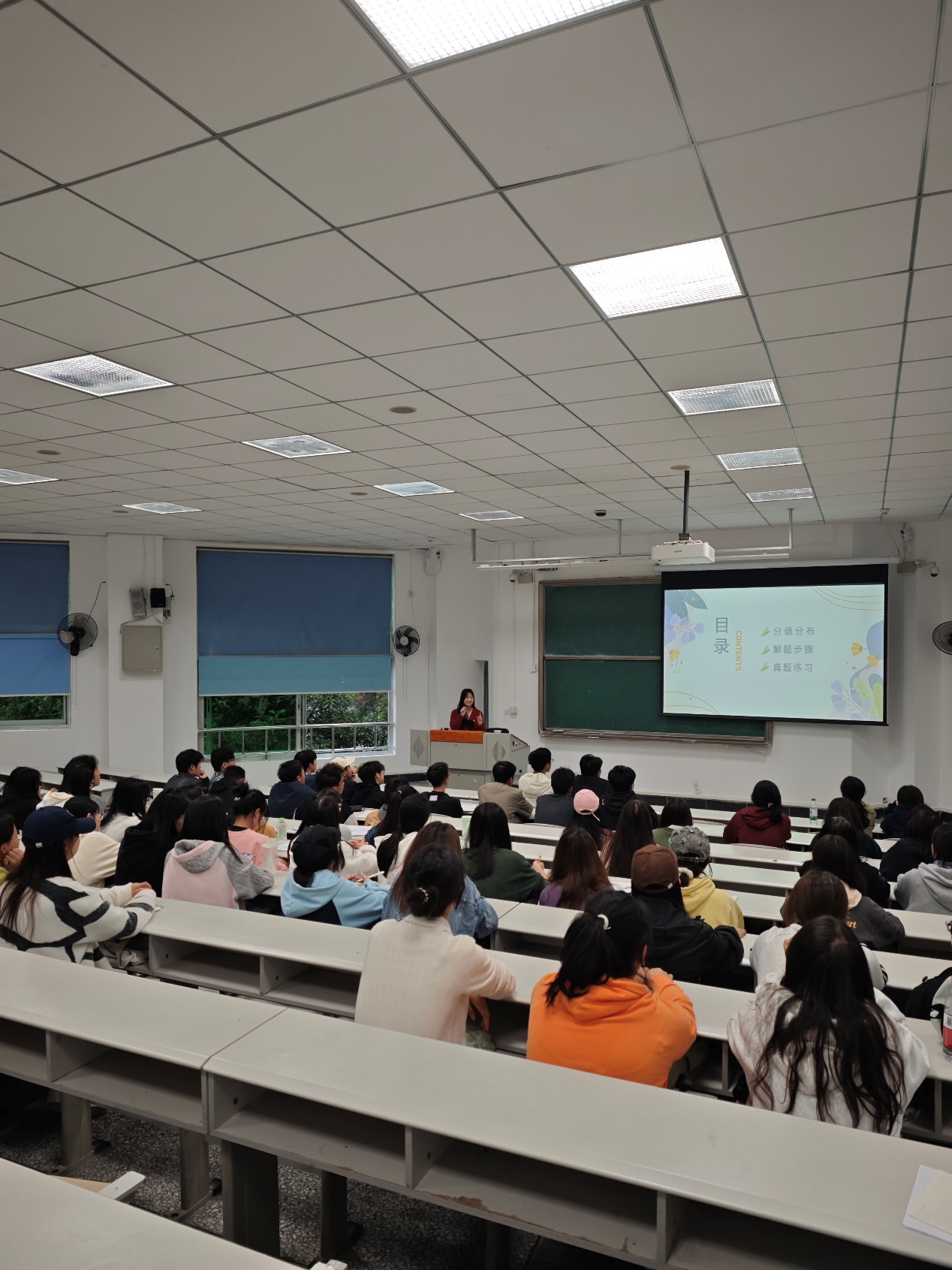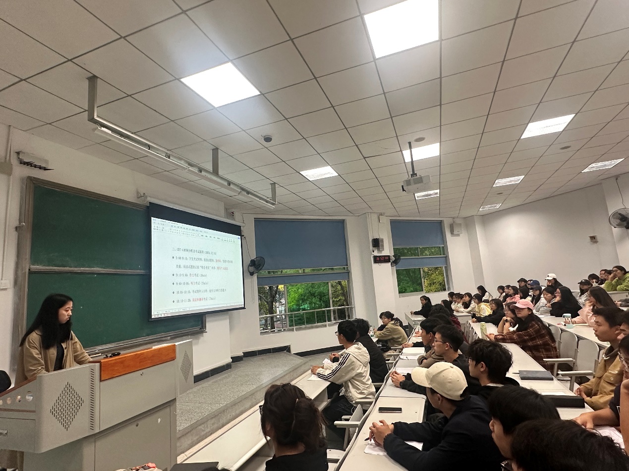 谢昕妤同志首先讲解了大学英语四级的试卷成分,提醒同学们要注意时间分配。接着向大家梳理了近几年真题出现的作文话题,分析了真题作文命题规律。然后向同学们讲解了大学英语四级写作要求和模版格式。最后强调写作时要注意书写工整。