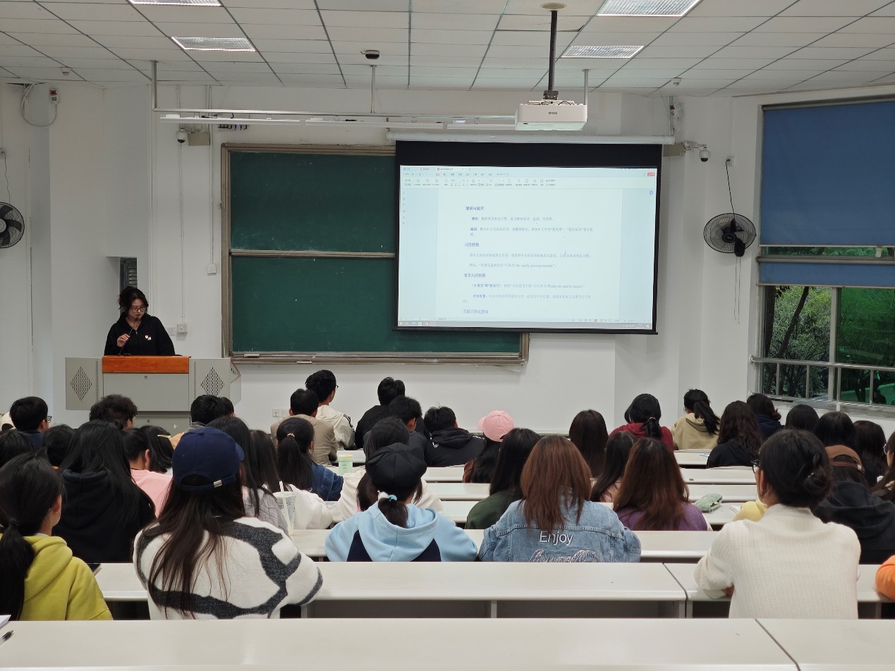 隋晓彤同志聚焦四级英语翻译板块中的汉英表达的差异性研究,以及如何提升汉英互译的准确性和流畅性。进一步阐释汉英表达在句式结构、词汇使用、语序和表达方式上的多重差异。带领同学们探讨了直译与意译的合理运用,并提出增词减词、词性转换等技巧,以适应英文表达习惯。特别是在文化内容翻译上,建议通过意译传达文化内涵,以增强同学们对翻译文本的深层次理解。