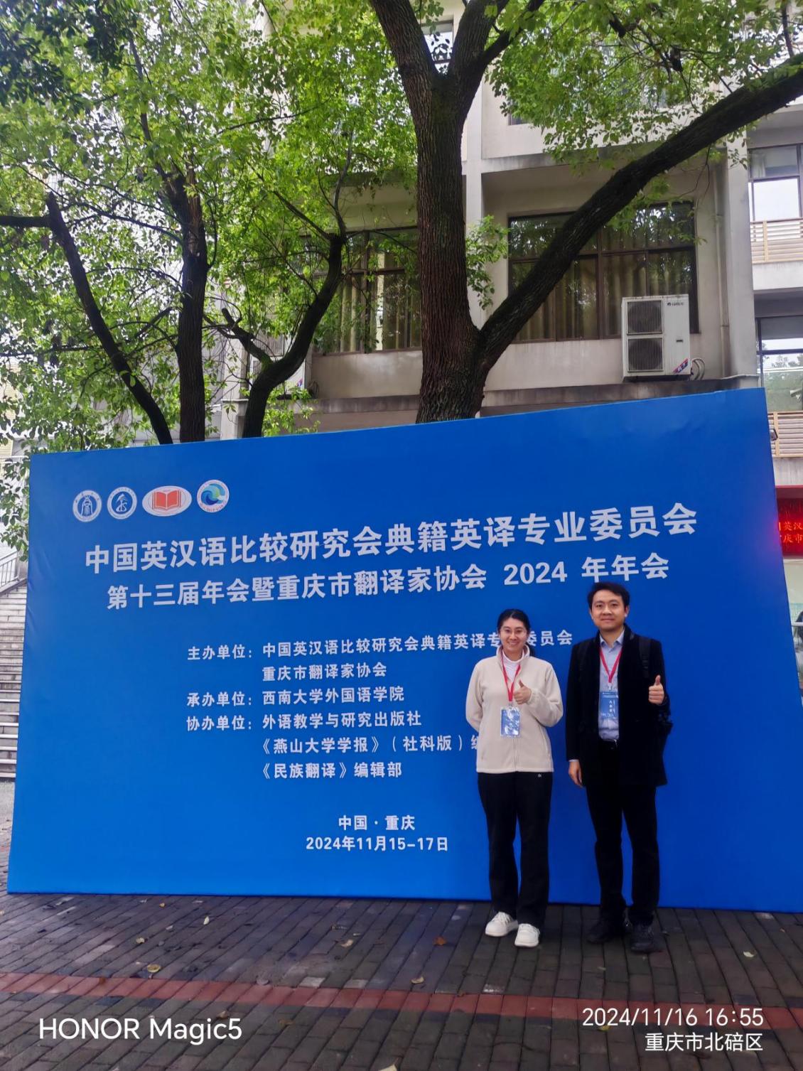 2024年11月15至17日,“中国英汉语比较研究会典籍英译专业委员会第十三届年会暨重庆市翻译家协会 2024年年会”在西南大学顺利召开,本次会议由西南大学betway88西汉姆联承办,外语教学与研究出版社、《燕山大学学报》(社科版)编辑部、《民族翻译》编辑部协办,来自全国各地院校代表共计200余人参会。我院英语系、翻译系教师梁勇博士与关宁博士参会并作报告。