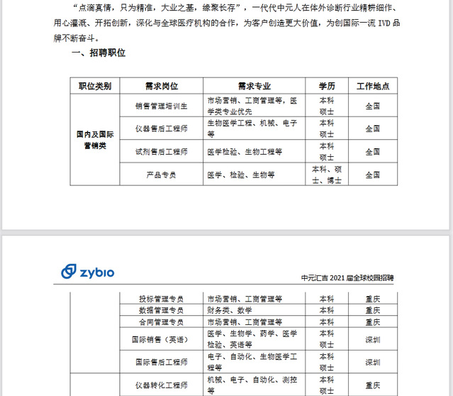 重庆中元汇吉生物技术有限公司2021届招聘简章