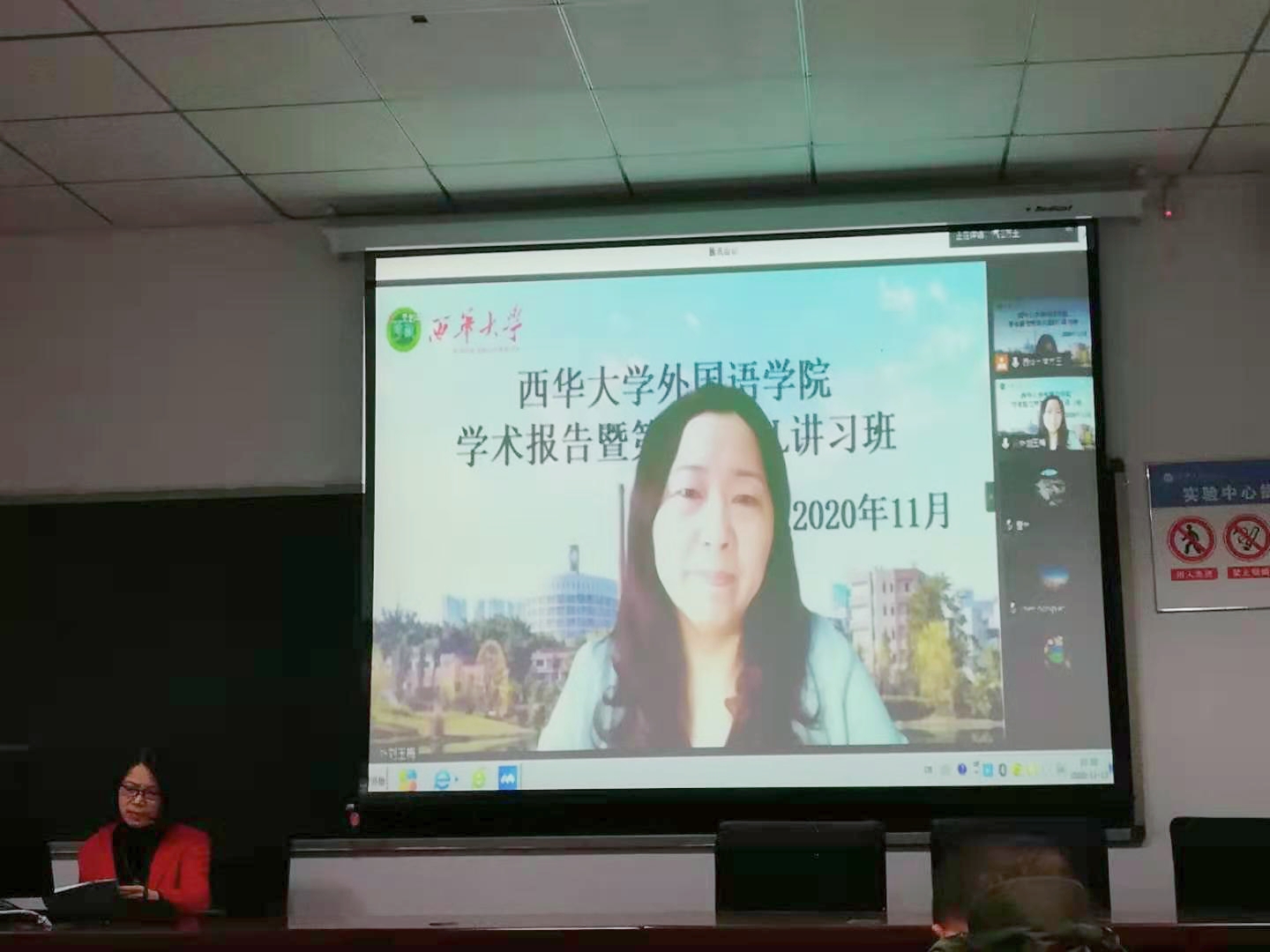 11月13日上午10时至12时,四川外国语大学博士生导师刘玉梅教授进行了题目为“基于体认识解机制的汉语修辞格分类研究”的学术报告。刘教授是四川外国语大学教授,博士生导师,国际关系学院院长,四川外国语大学教学名师,语言哲学与认知科学研究中心副主任,四川大学英语语言文学博士,上海外国语大学博士后,体认语言学研究会和中西语言哲学研究会副秘书长兼副会长,中国英语教学研究会常务理事,已在《外语教学与研究》、《现代外语》等权威核心期刊、核心期刊和省级期刊上发表论文50多篇,出版专著2部,学术编著3部,主编、参编教材3部,主持国家社科项目2项,中国博士后科学基金资助一等1项,重庆市社科、教委项目3项,省级重点教改立项1 项,省级教改一般立项1 项,省级教学团队负责人,获得重庆市高等教育教学成果一等奖1 项,二等奖2 项。
