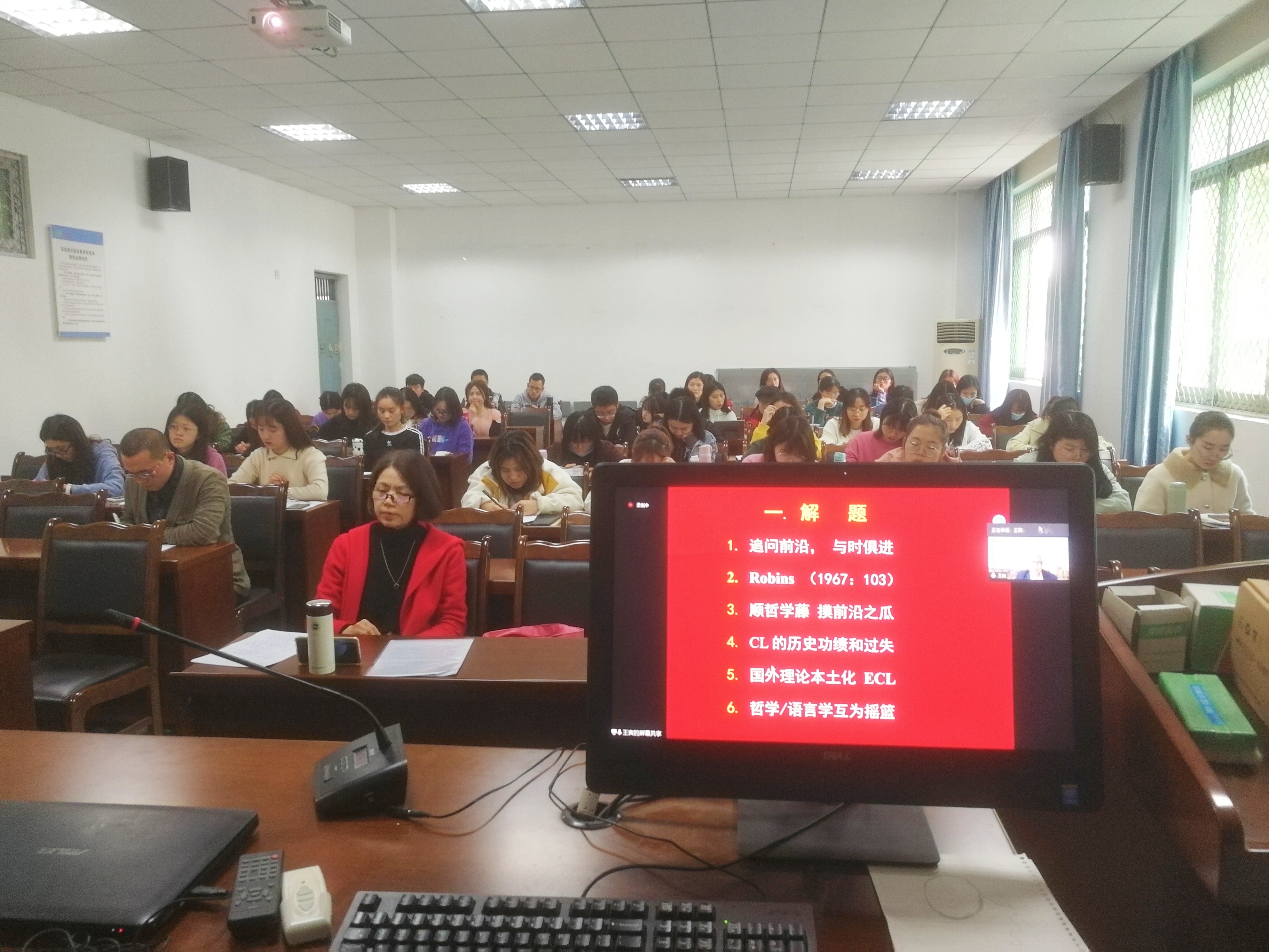 11月12日下午15时至17时,四川外国语大学博士生导师王寅教授进行了题目为“体认语言学的理论与实践——21世纪语言学前沿探索”的学术报告。王教授是四川外国语大学终身教授,博士生导师,语言哲学和认知科学研究中心主任,美国的中国后现代发展研究院高级研究员。现任中国体认语言学会会长,中西语言哲学研究会会长,中国翻译认知研究会顾问。王教授的主要研究领域有语言哲学、体认语言学、认知翻译学、构式语法和英汉对比等,已出版专著和教材40多部,发表论文300多篇,主持国家社科项目3项,获得教育部等省部级奖十多项。