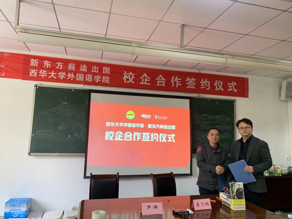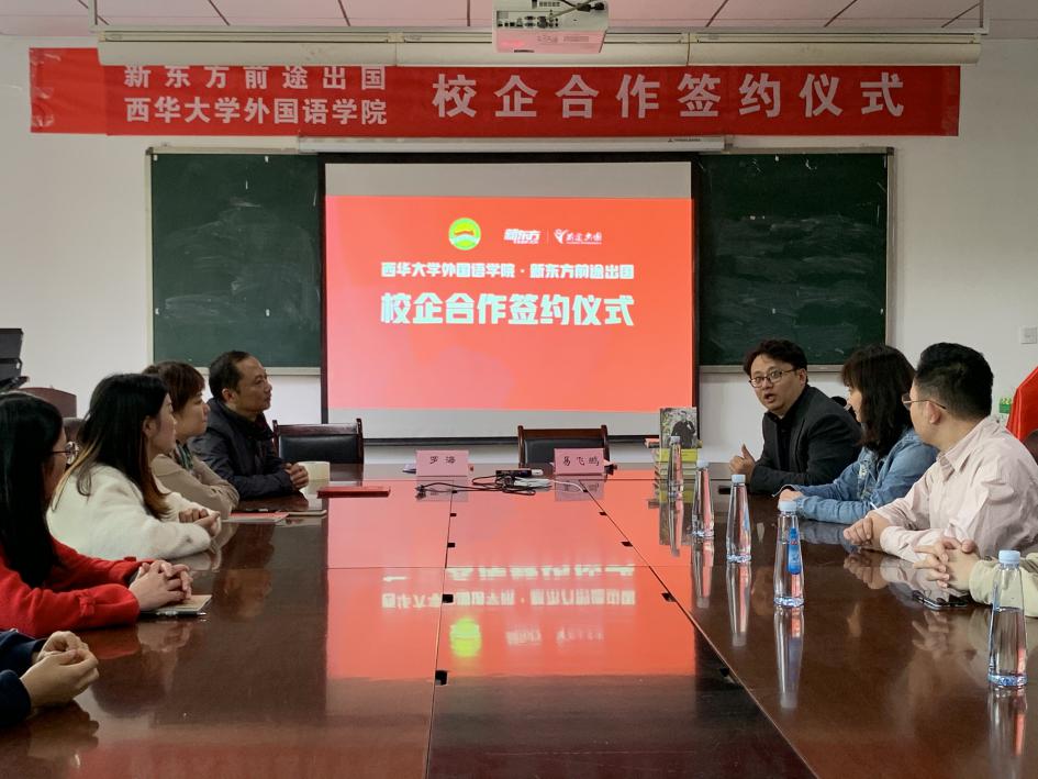 北京新东方前途出国咨询有限公司成都分公司总经理易飞鹏一行人与西华大学betway88西汉姆联党委副书记罗海、学工办主任曾渝理以及辅导员杨磊、罗雨虹老师在学院会议室举行了此次签约仪式暨授牌仪式。