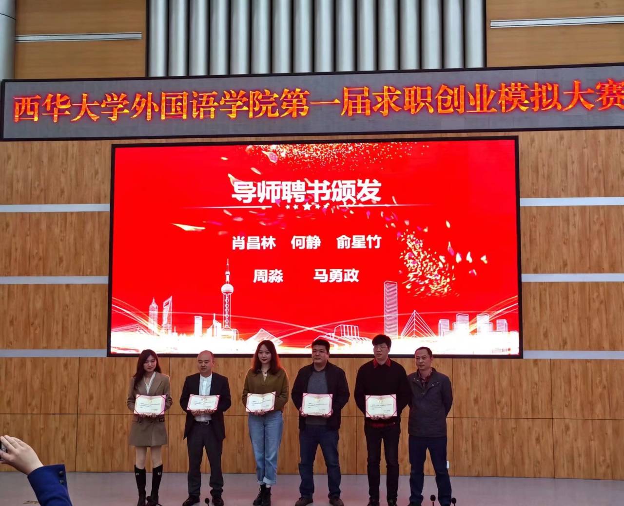 在主持人公布获奖名单后,各评委老师为选手们颁发奖状并合影留念。同时罗海书记也为五位评委老师颁发导师聘书并合影留念。