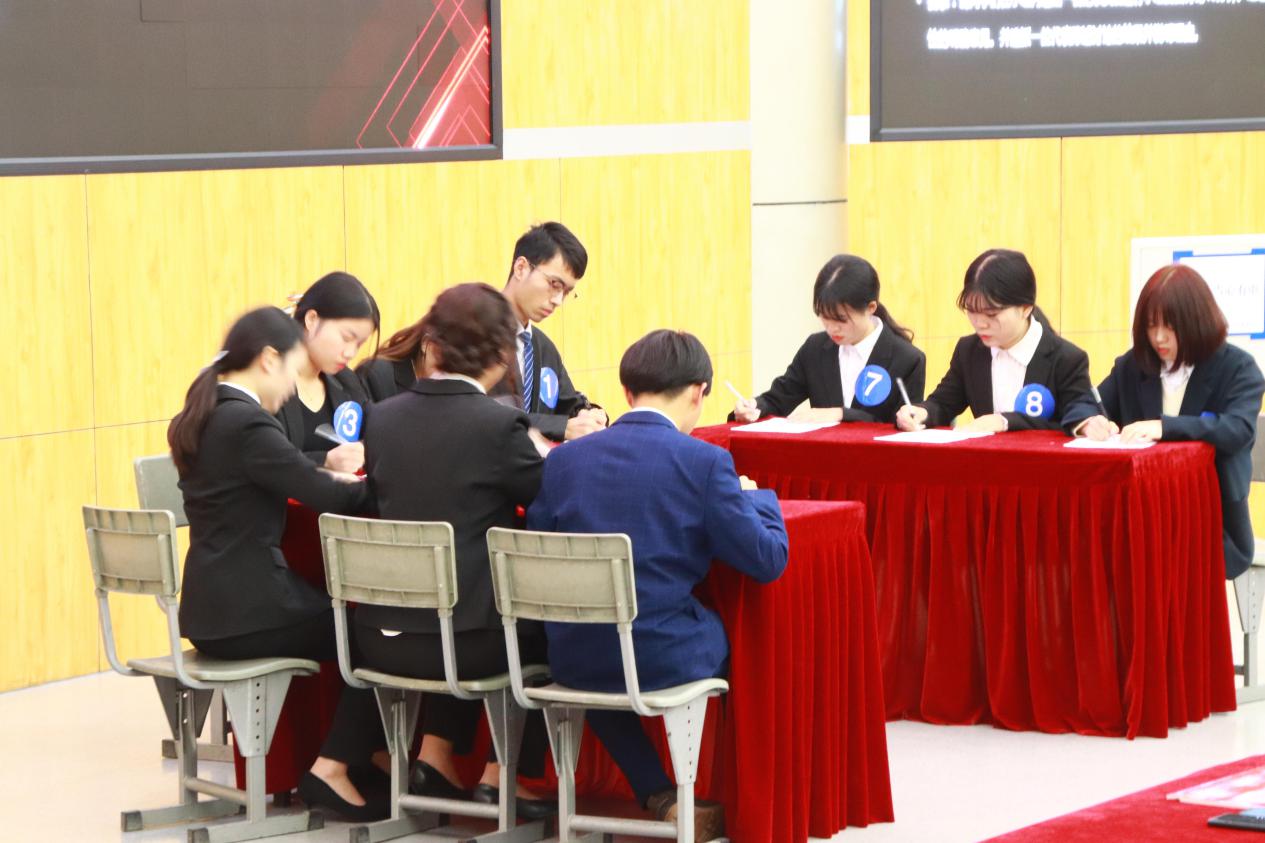 经过第一轮激烈的比赛后,最终前九位选手(其中并列一位)进入了第二轮面试:无领导小组面试。在宣布第二轮比赛规则后,团队合作答题环节正式开始。首先,每位选手根据大屏幕上的题目依次进行1分钟的发言;接着,九位选手进行15分钟的团队讨论,并在时间结束后推选出一位代表进行总结发言。