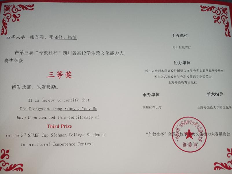 该项大赛由四川省教育厅主办,四川师范大学承办,四川省普通本科高校外国语言文学类专业教学指导委员会、四川省高等教育学会高校外语专业委员会协办。大赛深入贯彻落实习近平新时代中国特色社会主义思想,推动中外人文交流,加强当代大学生讲好中国故事,传播中国声音的外语能力。“外教社杯”全国高校学生跨文化能力大赛受中国教育国际交流协会指导,由上海外国语大学主办、上海外语教育出版社承办,于2023年被正式列入《全国普通高校大学生竞赛分析报告》竞赛目录,是认可度高的外语相关学科竞赛。