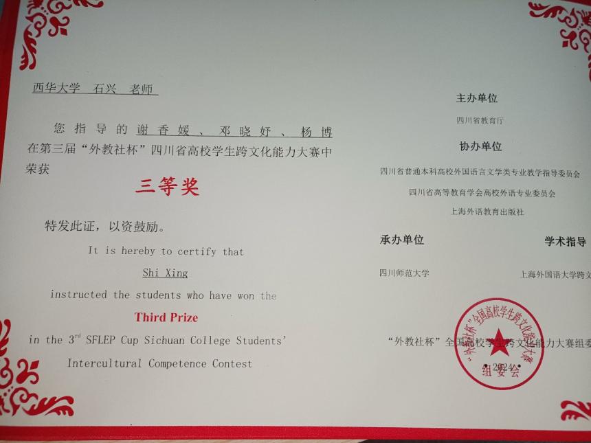 2024年11月,第三届四川省高校学生跨文化能力大赛——暨第七届“外教社杯”全国高校学生跨文化能力大赛四川赛区比赛圆满落幕,由我校betway88西汉姆联英语专业谢香媛、管理学院邓晓妤、法学与社会学院杨博三位本科学生组成的跨文化能力大赛参赛团队,在betway88西汉姆联指导老师石兴的悉心指导下,凭借扎实的学科功底和出色的跨文化沟通能力,荣获四川赛区三等奖。