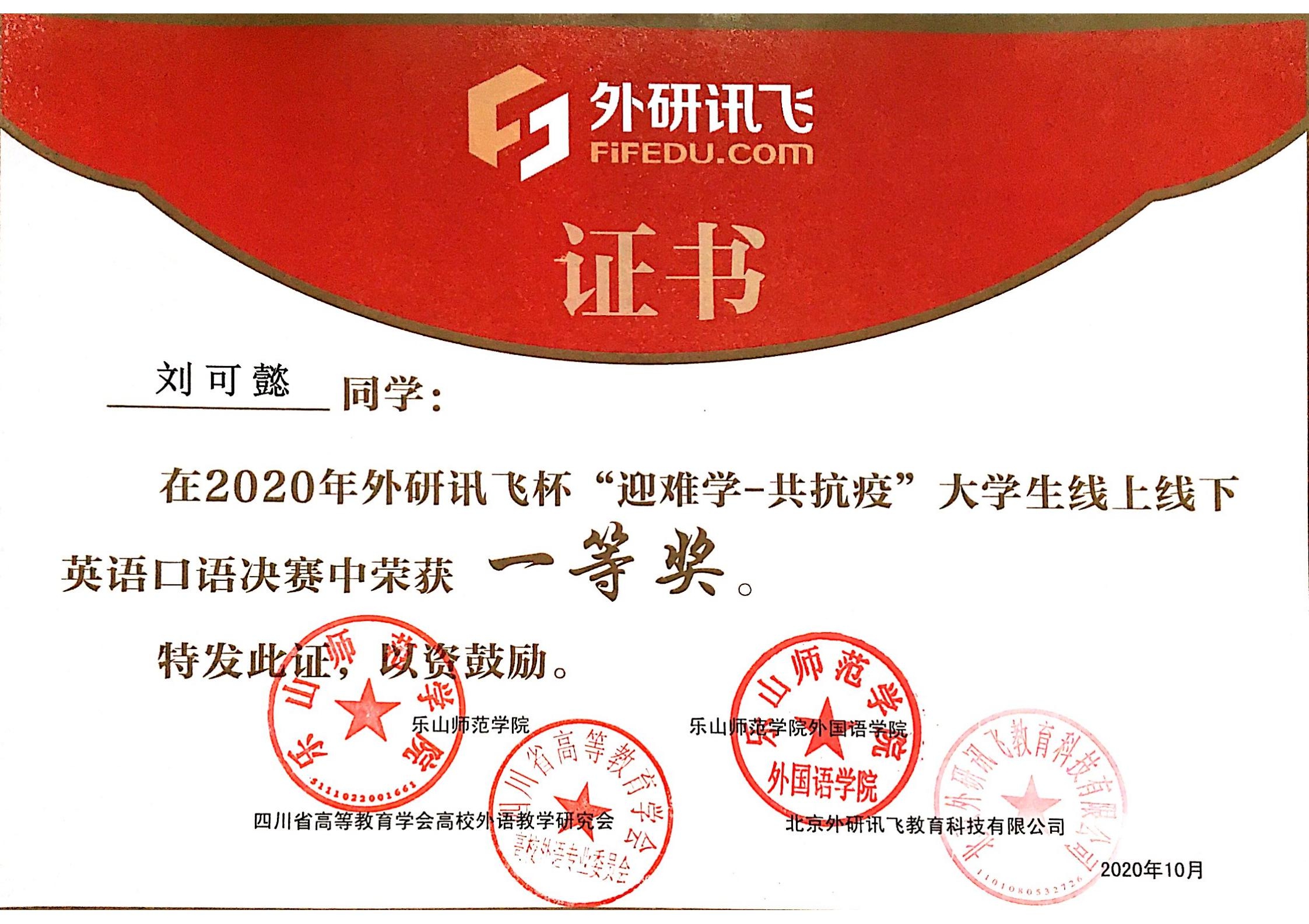 为贯彻落实习近平总书记关于疫情防控工作的重要指示精神以及教育部“停课不停学”的教学指导意见,由乐山师范学院主办、四川省高等教育学会高校外语教学研究会和北京外延讯飞教育科技有限公司协办的外研讯飞杯“迎难学-共抗疫”大学生线上线下英语口语大赛线上邀请赛圆满落幕。全省有西南交通大学、西南财经大学、西南石油大学、四川师范大学、西华师范大学、绵阳师范学院等共计38所院校积极参赛,参赛人数13849人。我校betway88西汉姆联2019级翻译专业刘可懿同学在本次大赛中凭借出色的表现,获得本次比赛一等奖。