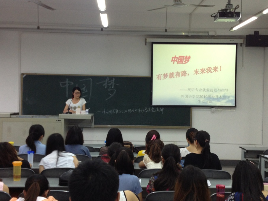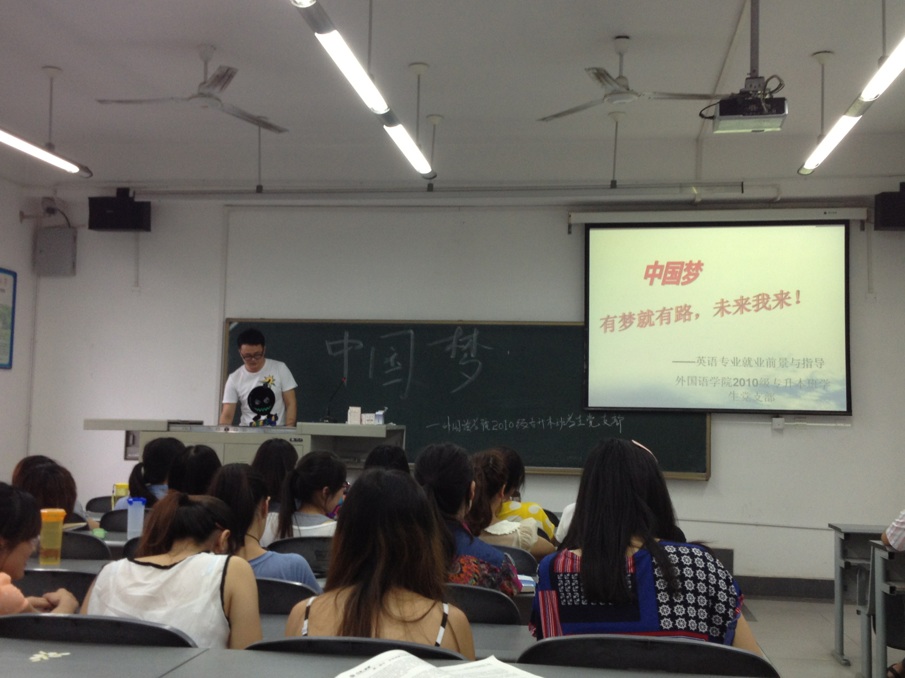 会上,支部组织委员何泽稀带领大家一同学习“中国梦”的相关内容,并观看了习主席深情阐释“中国梦”的相关视频。进一步让党员同志们认识到,实现中华民族伟大复兴的“中国梦”,就是要实现国家富强、民族振兴、人民幸福,就是必须走中国道路、弘扬中国精神、凝聚中国力量。宣传委员黄高翔与大家分享了英语专业的就业前景与指导,他说,作为国家未来的主力军,要把握自身与社会的联系,最终通过自己的努力为实现“中国梦”而做出贡献。会上,党员同志都纷纷发言,分享自己理解的“中国梦”和感悟,畅想个人发展规划,把个人奋斗融入实现社会主义现代化的共同奋斗之中。