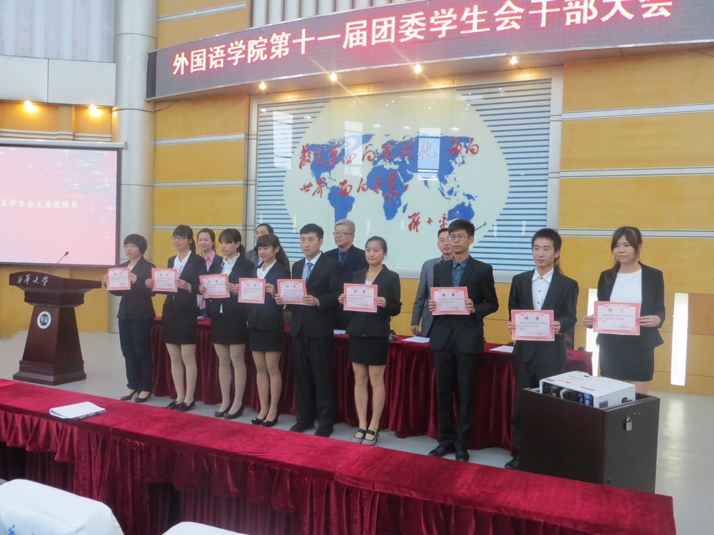 大会在庄重肃穆的国歌声中拉开了帷幕。首先,第十届团委学生会主席石雨萌总结了上届团委学生会工作,分享了学生工作的感悟与收获,并以“学历是铜牌,能力是银牌,思维是金牌,德行是王牌”表达了对第十一届团委学生会的美好祝愿。其次,学院团委书记曾真汇报了第十届团委学生会的工作,各方面工作顺利开展并取得可喜成绩。接着,曾国勇副教授宣读了新一届学生干部调整名单,并颁发了聘书。新一届团委学生会主席任壁作了对未来一年工作的设想展望,表示虽然责任重大,但充满信心,带领新一届团委学生会更好的发展。