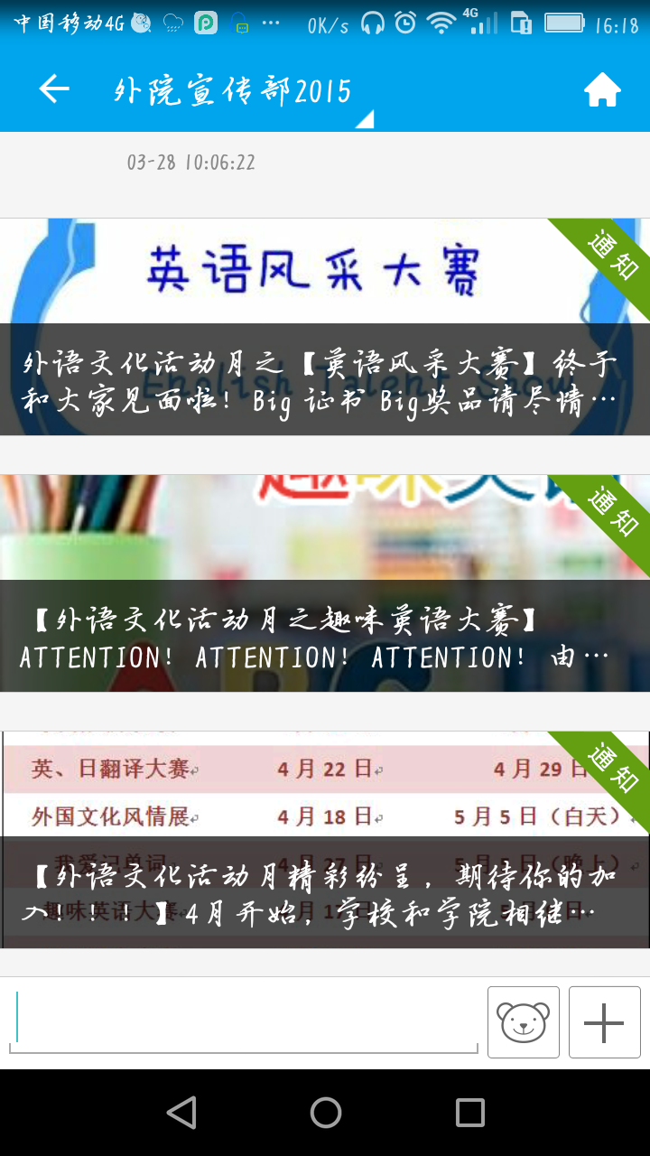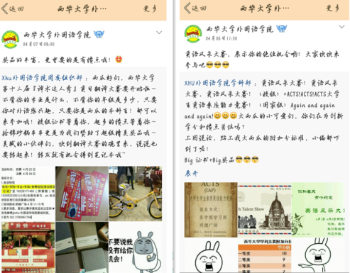 由我院主办的西华大学第十三届科技文化艺术节之外语文化活动月系列活动于4月正式拉开序幕,宣传报名工作正在如火如荼的进行。外语文化活动月以营造外语学习氛围,提高全校学生外语学习积极性和整体学习水平,提升全院学生的专业学习能力及综合素质为宗旨,以展示我校学生风采,丰富校园文化生活为目的。
