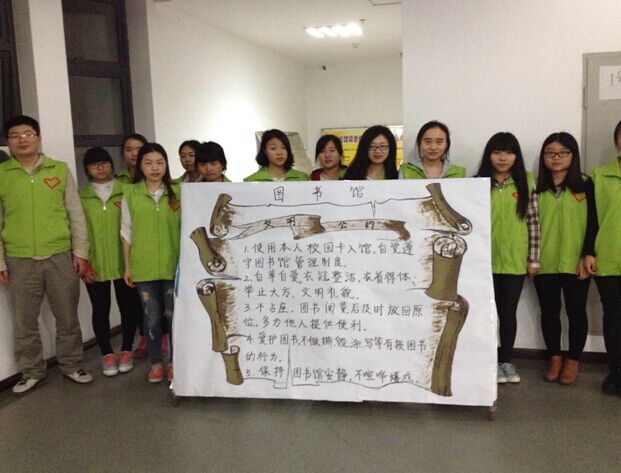 活动中,同学们分为5组,负责不同楼层的文明劝导。同学们主动为每位进出图书馆的同学讲解,倡导图书馆文明秩序,文明看书,劝导同学们不大声喧哗,不吃零食和不乱扔垃圾,提醒准备离开图书馆的同学带走自己的相关物品,并帮助图书馆工作人员整理图书。