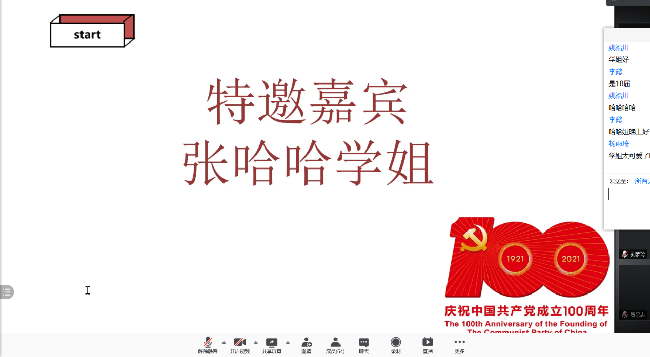 由betway88西汉姆联团委学生会办公室、学科部联合举办的以“忆往昔峥嵘,扬逐月之帆”为主题的读书分享会于2021年3月27日晚7点在腾讯会议以线上的方式顺利举办。分享会邀请betway88西汉姆联团委学生会指导老师兼19级辅导员彭陈丽老师、第十五届betway88西汉姆联团委学生会主席兼优秀毕业生张永会学姐作为特邀嘉宾,与同学们一道喜迎建党100周年,激发阅读热情,回望光辉岁月。