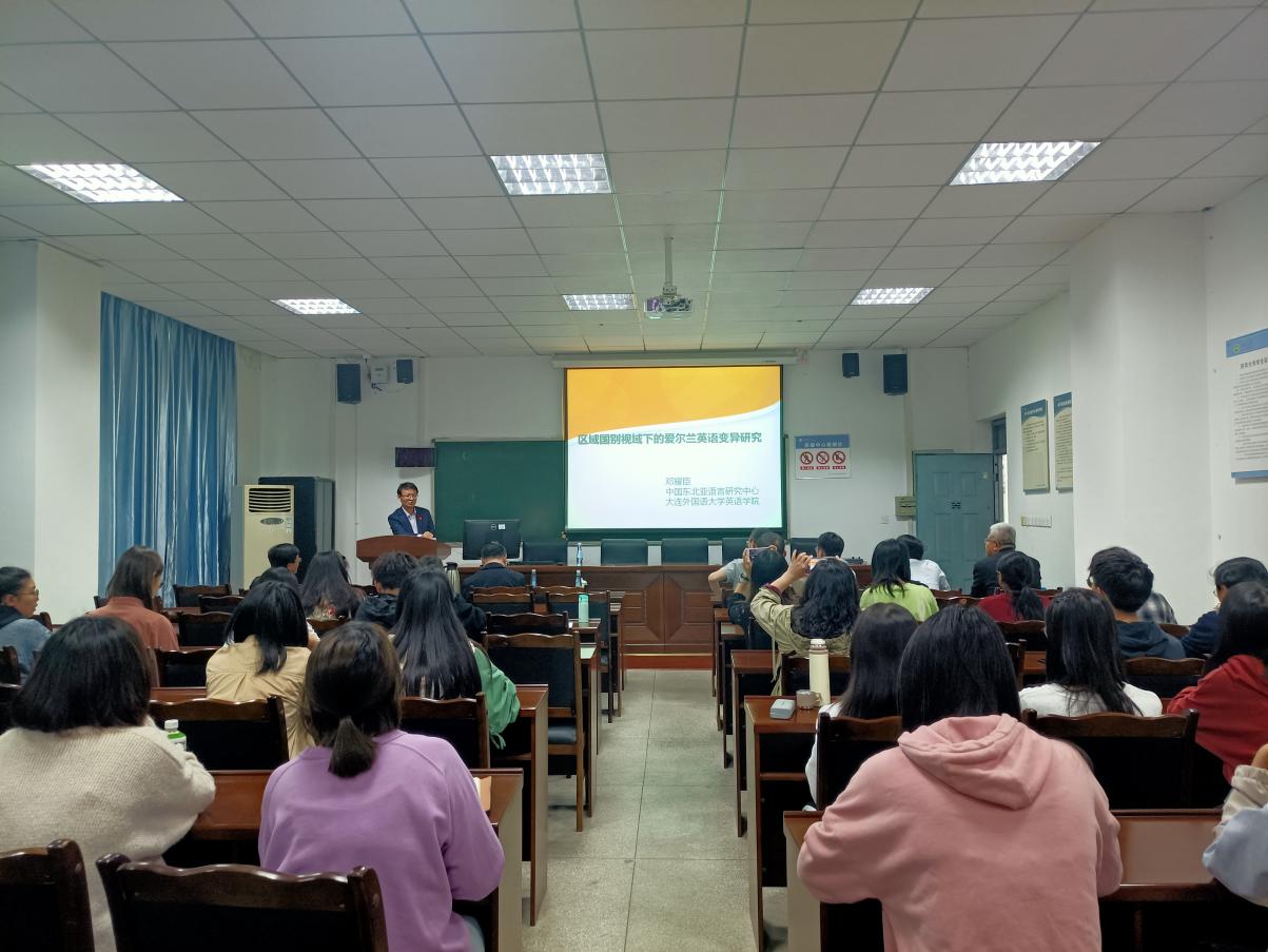 本次讲座邓博士主要介绍了“区域国别视域下语言变异研究的意义、爱尔兰英语变异研究综述、爱尔兰英语中道歉言语行为变异研究”三个方面的内容。在区域国别视域下语言变异研究的意义上,邓博士介绍了语言在“一带一路”建设中的重要作用,突出语言是各项政策、法规、措施的表述手段,展现出语言连通是实现设施联通、贸易畅通的关键。因此,区域国别视域下开展英语语言变体及变异研究,有利于揭示同一语言的社会变化规律,推动语言为“一带一路”铺路搭桥任务的实施,助力“双通”人才的培养。在爱尔兰英语变异研究方面,邓博士向大家介绍了许多用于爱尔兰英语变异研究的语料库,如The Limerick corpus of Irish English; A corpus of Irish English, The Northern Ireland Transcribed Corpus of Speech, ICE-IRELAND Corpus, The SPICE-Ireland Corpus, A cordus of Irish English correspondence等。同时,邓博士通过几个案例指出爱尔兰英语与标准英式英语在音调、词汇、形态、句法方面存在差异,爱尔兰不同地域之间、不同社会阶层使用者的语言也呈现出规律性变异特征。