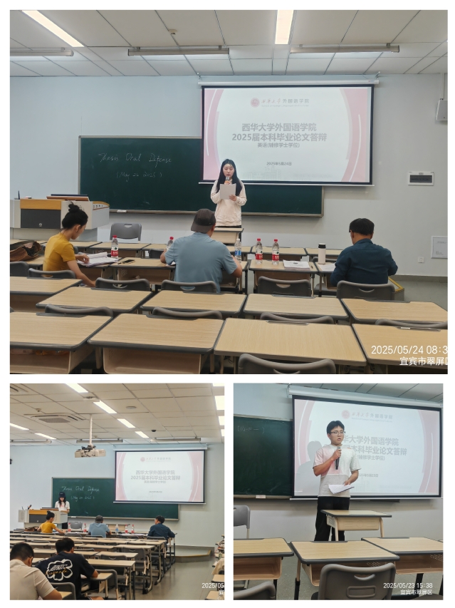 5月23日和24日,betway88西汉姆联2025届本科英语专业辅修学士学位论文答辩在西华大学宜宾校区第二教学楼如期举行。参加本次答辩的学生主要为21级和22级主修为理工、社科等多个专业的在校生,共计50人参与答辩,参加答辩指导的老师共计15名,设为5组进行,每组包括10名左右的答辩学生和3位答辩指导教师。