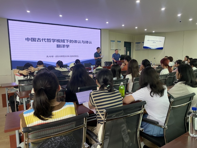 孔令翠教授开宗明义,强调“体认”是中国古代哲学的核心概念。他系统梳理了从先秦以来各大哲学流派围绕“本末论”、“体用论”、“格物致知论”、“知行合一论”等重要命题,对“本”、“体”、“用”、“认”、“悟”、“知行”、“默识”等概念的深刻探讨,清晰勾勒出其内涵演变与发展脉络。孔教授指出,王寅教授创立的“体认翻译学”绝非无源之水,其理论根基正是深植于这份悠远而厚重的中国古代体认哲学传统之上。孔教授进一步阐释,中国古代体认哲学不仅为体认翻译学的诞生奠定了坚实无比的哲学基石,其蕴含的丰富智慧更为该理论未来的拓展提供了源源不断的滋养。他特别就“体”与“认”这两个核心范畴的内涵深化与当代转化,提出了自己独到的见解,展现了体认翻译学强大的生命力和广阔的发展空间。