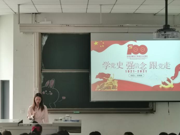 大会上,彭陈丽老师以“学党史,强信念,跟党走”为主题带领同学们一起回顾了中国共产党的峥嵘岁月。始终坚持党的领导,关键在于要朝着建设中国特色社会主义的伟大事业和实现中华民族伟大复兴的宏伟目标奋勇前进。一百年来,不管是从无到有的伟大革新,还是不断推进马克思主义中国化的征程都从未停下脚步。