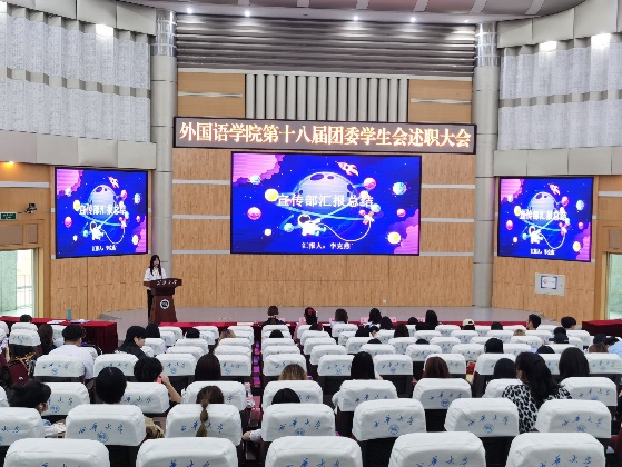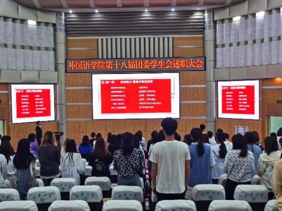 会议开始,全体成员起立奏唱共青团团歌,激荡而悠扬的歌声昭示着团委学生会全体成员的认真工作的激情和迎难而上的决心。接着,团委指导老师彭陈丽上台发言,向为外院团委学生会工作付出的全体同学表示感谢;总结学生会在发展过程中的不足与进步,对即将卸任的18届团委学生会干部给予建议,对未来的团委学生会干部提出期望。