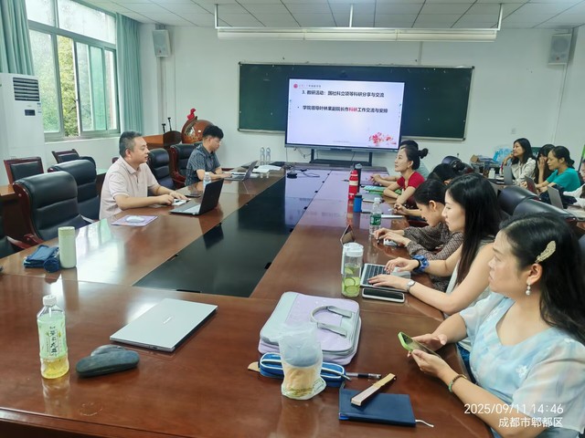 2025年9月11日下午,西华大学betway88西汉姆联英语系、翻译系在学院317会议室联合召开新学期教研工作会议,宜宾校区教师通过线上方式同步参会。学院副院长叶林果出席会议并作工作指导。会议聚焦政治理论学习、新进教师交流、教学工作部署、国家社科项目申报经验分享四大核心议题,开展了深入研讨和交流。