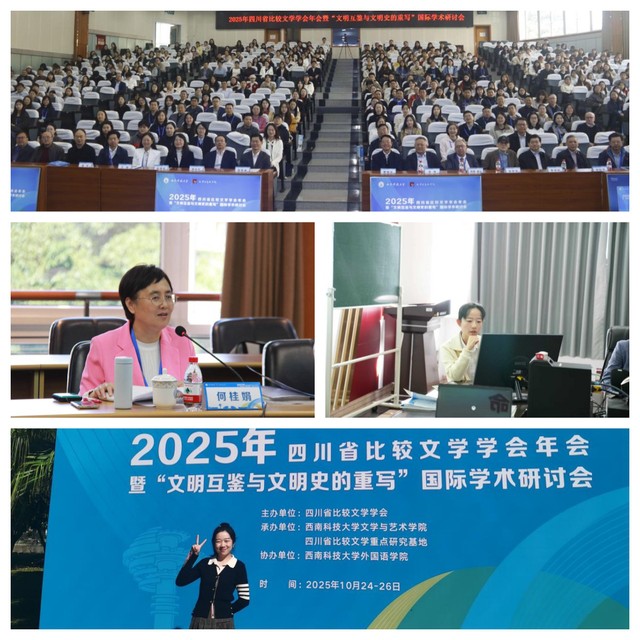 2025年10月24至26日,四川省比较文学学会2025年年会暨“文明互鉴与文明史的重写”国际学术研讨会在四川省绵阳市召开。此次会议由四川省比较文学学会主办,西南科技大学文学与艺术学院、四川省比较文学重点研究基地承办,西南科技大学betway88西汉姆联协办。betway88西汉姆联副教授何桂娟、曹美琳博士、王洵博士受邀出席参会。