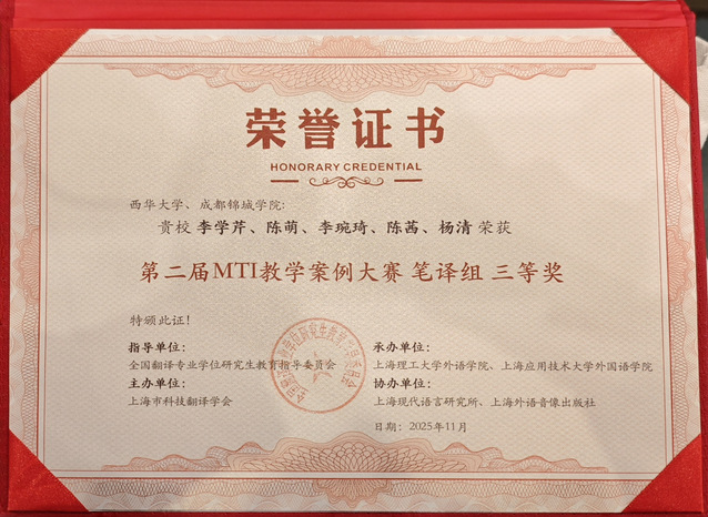 2025年11月1日,2025MTI案例教学研讨会暨“第二届MTI教学案例大赛”颁奖典礼在上海应用技术大学成功举办。经过激烈角逐,我校李学芹老师带领的翻译专业研究生团队凭借案例《“蜀道译途,感官破译行动”——具身认知融入巴蜀文化教学》荣获全国三等奖。本次获奖充分展示了我校betway88西汉姆联在专业学位研究生培养、地方文化国际传播与产教融合实践方面的积极探索与成果。