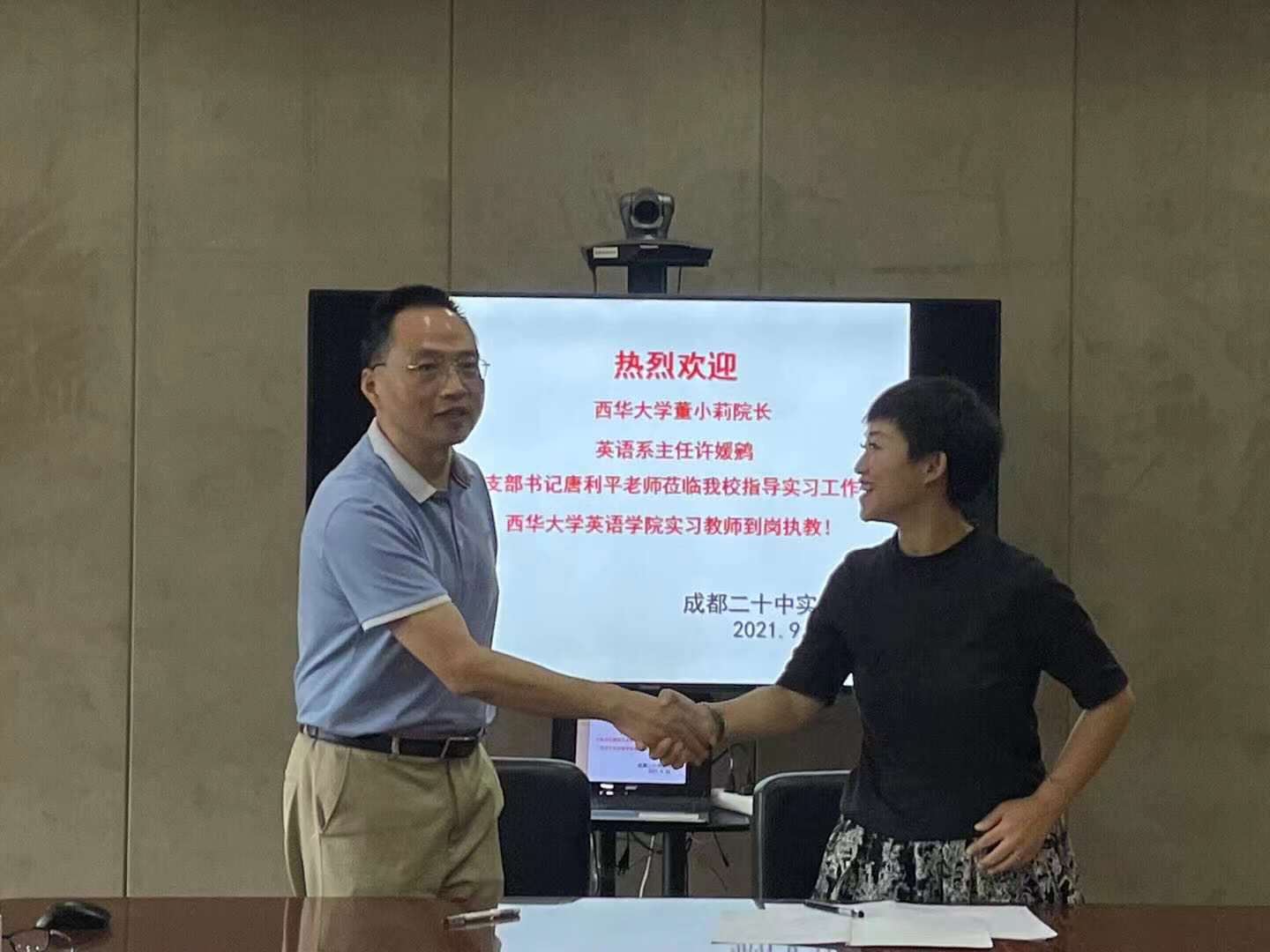 9月22日上午9时,由成都市二十中学初中部的梁碧玉老师在校门口迎接betway88西汉姆联师生并前往会议室,双方老师相互介绍后由成都市二十中学初中部杨主任主持会议,张校长和梁老师前后介绍了学校的历史、校训以及对实习生的要求。betway88西汉姆联董院长讲述了学院与成都市二十中资源共享,教师共同进步的愿望。许媛鹓老师与唐利平老师也先后介绍了betway88西汉姆联对于实习生在二十中实习的要求并强调了往返途中的安全问题。融洽对接后,betway88西汉姆联董院长与成都市第二十中学张校长代表双方签订了“共建西华大学英语专业教学研究与教学实践基地”协议,会议顺利结束。