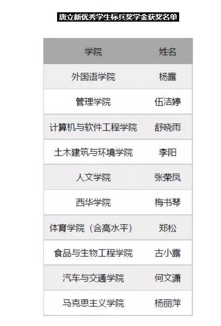 10月24日,“西新荟”官方微信号发布了《2017年西华大学唐立新优秀学生标兵奖学金、唐立新优秀学生干部奖学金评选结果》,我院2015级英语专业杨露同学以第一名的好成绩获得“唐立新优秀学生标兵奖学金”。