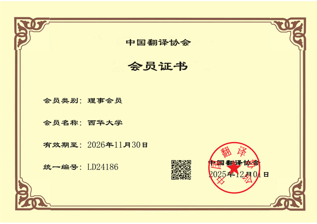 2025年12月,西华大学经中国翻译协会(以下简称“中国译协”)审核正式获批成为其理事单位。这一资格的取得,标志着西华大学在翻译教学、翻译研究与应用语言服务领域所取得的成效获得了国内翻译界权威机构的认可。