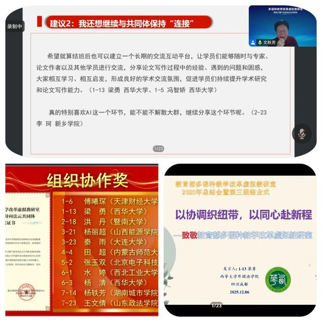 2025年12月6日,为期两年的教育部多语种教学改革虚拟教研室项目圆满落幕,西华大学betway88西汉姆联英语系主任梁勇、英语系冯智娇博士、日语系杨清老师组成的教师团队顺利结业,并获“组织协作奖”与“勤奋进取奖”等多项荣誉,为外语教育教学改革事业再添亮丽成果。