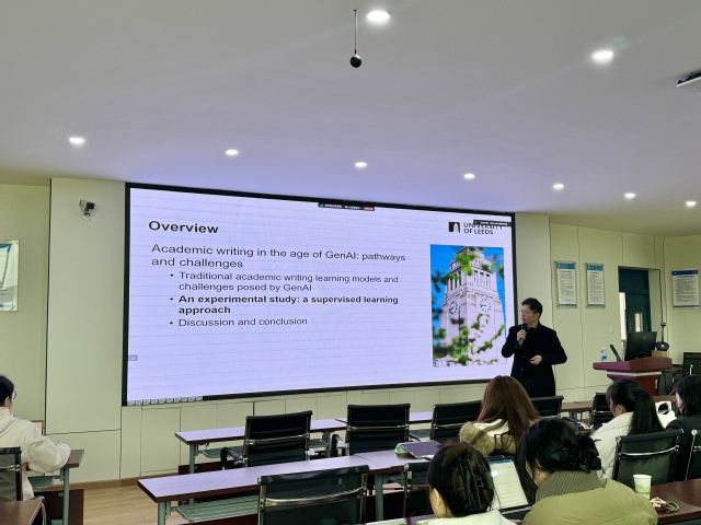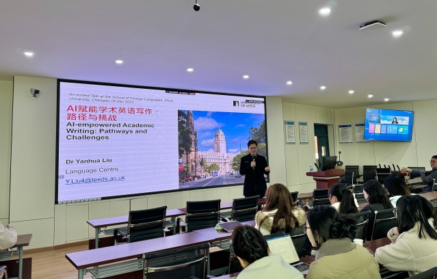 为探讨人工智能时代学术英语写作教学的新范式,提升师生数字素养与教学创新能力,2025年12月18日下午,betway88西汉姆联在4C-504教室成功举办题为“AI赋能学术英语写作:路径与挑战”的学术讲座。本次讲座特邀英国利兹大学语言中心学术英语讲师、博士生导师刘焰华博士担任主讲,讲座由西华大学betway88西汉姆联教师张玄主持,吸引了西华大学betway88西汉姆联部分教师、研究生以及西南交通大学betway88西汉姆联部分教师到场聆听。