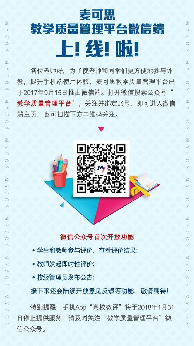 备注:教学质量管理平台微信端已正式上线,推荐各位老师及学生关注“教学质量管理平台”微信公众号,参与评教,获得更好的手机端体验,如有疑问,关注后回复“帮助”即可查询相关问题解答。