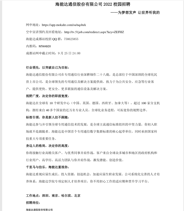 海能达通信股份有限公司2022校园招聘