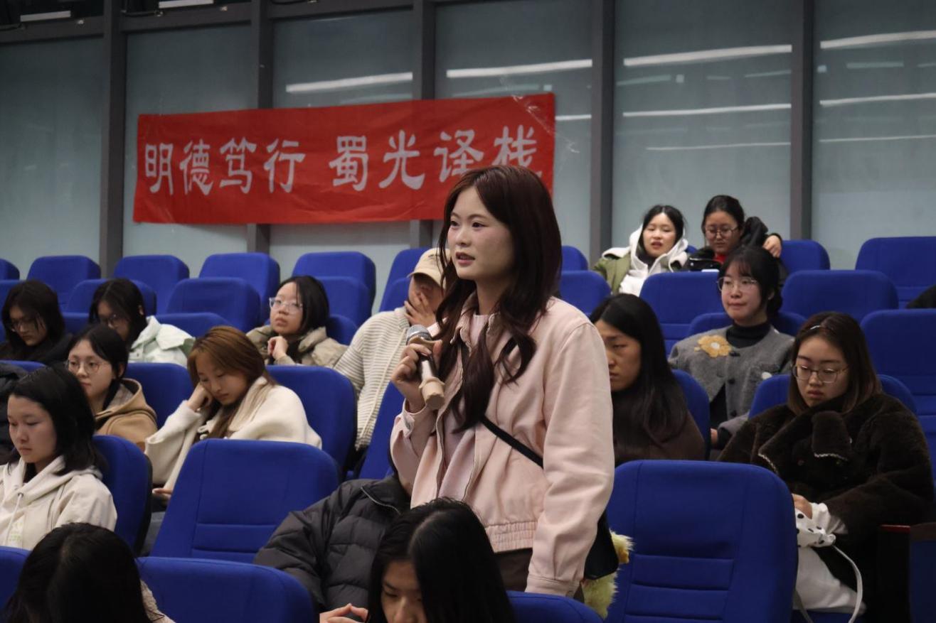 在互动答疑环节,王阿秋老师结合自身丰富经验与行业实际,围绕升学备考、就业方向选择、学业与实践平衡等同学们普遍关心的热点问题,用生动具体的案例帮助同学们理清思路、明确方向。同时,他还结合语言学习特点,向同学们生动阐释了语言运用的技巧与魅力,引导大家夯实专业基础,让在场同学深受启发。紧接着,同学们踊跃提问,行业讲师对同学们的问题进行认真解答。