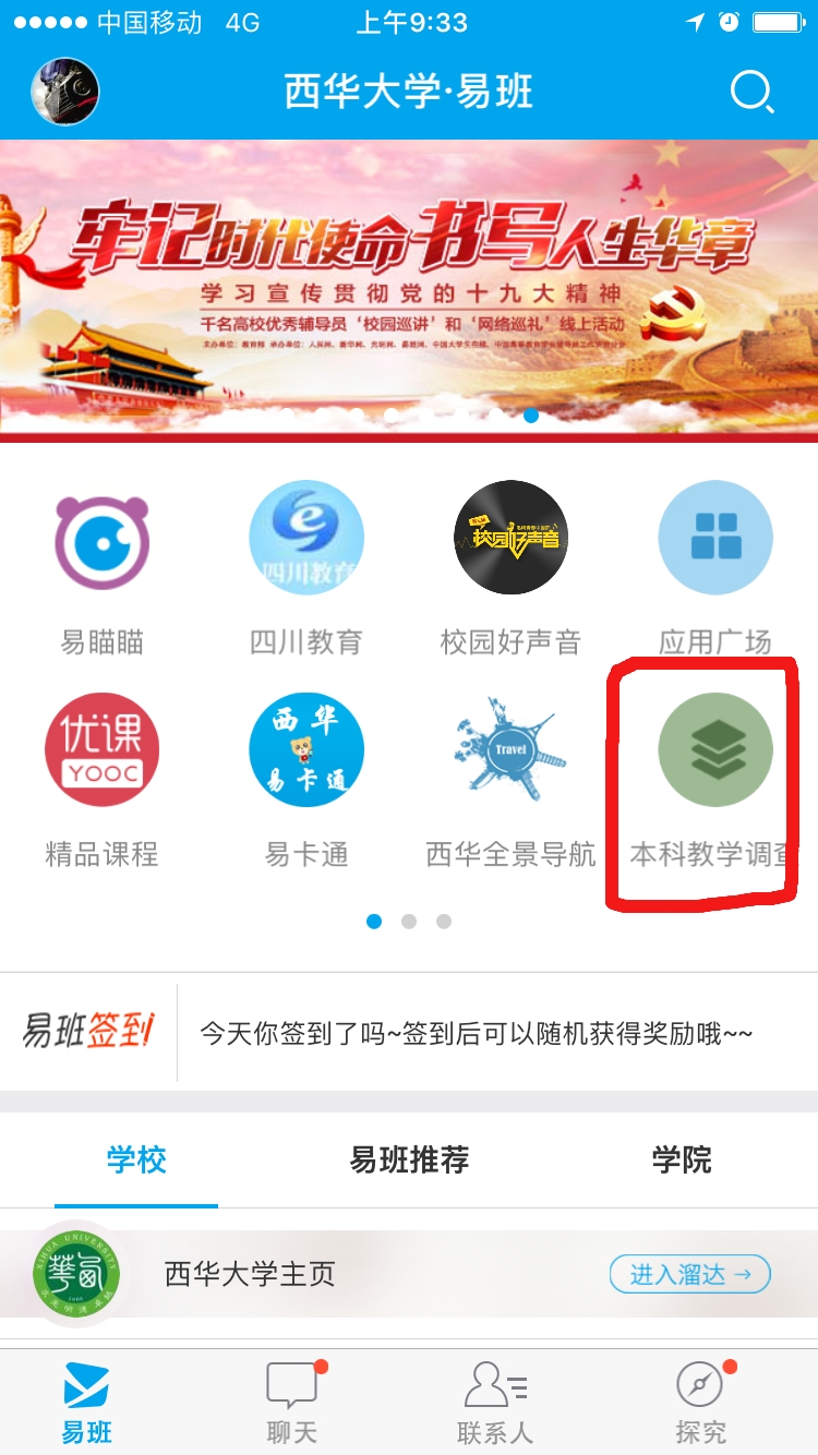 打开易班APP,登陆西华大学易班,在首页找到“本科教学调查”。点击访问,填写调查问卷,完成全部16个题即可。